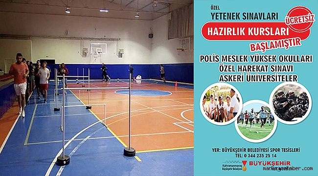 Kahramanmaraş Büyükşehir Belediyesi tarafından askeri ve polis okullarına girmek için özel yetenek sınavlarına hazırlanan öğrencilere yönelik verilen ücretsiz kurslar Büyükşehir Belediyesi Spor Salonu’nda (orman dairesi) çalışmalar başladı.Özel yetenek sınavları hazırlık kurslarına katılmak isteyenler Kahramanmaraş Büyükşehir Belediyesi Gençlik ve Spor Şube Müdürlüğü’ne müracaat edebilecekleri gibi 0344 235 25 14 nolu telefondan da bilgi alabilirler.Haftanın üç gününde yapılan özel yetenek sınavları hazırlık kursları Salı-Perşembe ve Cumartesi günleri saat 17.00 ile 19.00 arasında Büyükşehir Belediyesi Spor Salonunda (Orman Dairesi) yapılmaktadır.