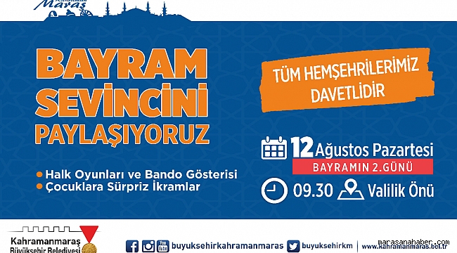 12 Ağustos Pazartesi günü Valilik önünde gerçekleştirilecek Büyükşehir Bayramlaşma programı kapsamında Halk Oyunları Ekibi ve Bando Takımı performans sergileyecek, çocuklara özel ikramlar olacak.
