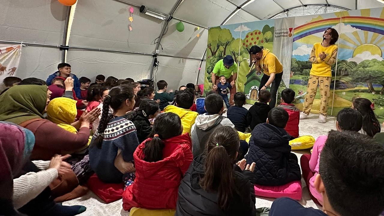 Depremin yol açtığı yaraların sarılması, hayatın normale dönmesi ve vatandaşların tüm ihtiyaçlarının eksiksiz olarak karşılanması noktasında çalışmalarını yoğun bir şekilde sürdüren Kahramanmaraş Büyükşehir Belediyesi, afet sonrası çocukların yaşayabileceği travmaları en aza indirmek ve sosyalleşmelerini sağlamak için de faaliyetlerine devam ediyor. Geçici barınma alanlarına çocuklar için oyun grubu ve spor alanları kazandıran Büyükşehir Belediyesi, şehir genelinde birbirinden eğlenceli tiyatro gösterilerini de miniklerle buluşturuyor. Şehir merkezinde ve ilçelerde kurulan geçici barınma merkezlerini ziyaret eden gösteri ekibi, sahneledikleri oyunlarla çocukların yüzünü güldürüyor. Renkli dekor ve kostümlerle miniklerin dikkatini çeken tiyatro gösterileri, çeşitli müzik ve danslarla da çocukların neşe kaynağı oluyor. Oyuncularla birlikte şarkılar söyleyip dans eden çocuklar bir yandan doyasıya eğlenirken bir yandan da sosyalleşiyor.
