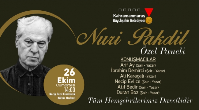 Büyükşehir Belediyesi 6. Kitap ve Kültür Fuarı kapsamında Kahramanmaraşlı fikir insanı Nuri Pakdil anısına özel panel düzenliyor. Programa Yazarlar Arif Ay, İbrahim Demirci, Ali Karaçalı, Necip Evlice, Atıf Bedir ve Duran Boz konuşmacı olarak katılıyor.