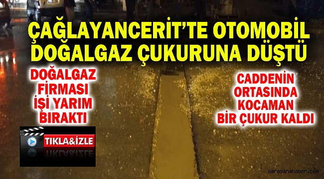 Olay, dün akşam saatlerinde meydana geldi. Edinilen bilgilere göre Çağlayancerit ilçesinin Fatih Mahallesi'nde doğalgaz çalışması yapıldı. Çalışma yapan çalışanların, açılan çukuru sağlıklı bir şekilde doldurmadığı gibi güvenlik önlemi de almayınca kaza kaçınılmaz oldu. Dün etkili olan yağmur nedeniyle açılan çukurlar su ile doldu. Çalışmanın yarım bırakıldığı çukura bir otomobil düştü. Kazada araç sürücüsü hafif yaralanırken araç sürücüleri ve ilçe halkı ise çalışmanın yarım bırakılmasına ve güvenlik önlemi alınmamasına tepki gösterdi.