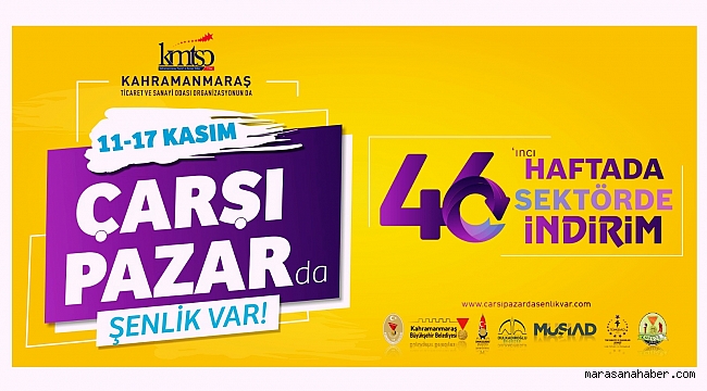 kahramanmaraş Büyükşehir Belediyesi, Valilik ve STK’lar işbirliği ile şehirde Çarşı Pazar Şenliği başlıyor. Ticaret ve Sanayi Odası organizasyonunda, MÜSİAD, TÜMSİAD ve KMESOB üyelerinin katılımıyla gerçekleştirilecek şenlikte 46 sektör yer alacak. 11 – 17 Kasım tarihleri arasında gerçekleştirilecek şenlik kapsamında ürünlerde yüzde 46’ya varan indirimler yapılacak.
