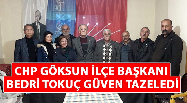 Cumhuriyet Halk Partisi Göksun İlçe Başkanlığı görevini yürüten Bedri Tokuç, 14 Aralık Cumartesi günü ilçe Başkanlığı binasında gerçekleşen ve Delegelerin yoğun katılım sağladığı Kongrede 41 oy alarak güven tazeledi.