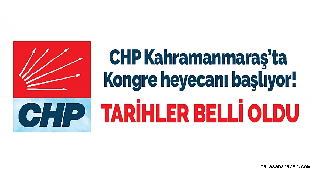 Cumhuriyet Halk Partisi (CHP) Kahramanmaraş’ta ilçe başkanlıklarının kongre takvimi belli oldu.CHP kahramanmaraş İlçe Kongre Takvimi :14.Aralık 2019 Cumartesi Günü Saat 10.00 'da Dulkadiroğlu ilçesi,14.Aralık 2019 Cumartesi Günü Saat 12.00'de Göksun ilçesi,15.Aralık 2019 Pazar Günü Saat 10.00'da Onikişubat ilçesi,15.Aralık 2019 Pazar Günü Saat 12.00'de Pazarcık ilçesi,20.Aralık 2019 Cuma Günü Saat 10.00'da, Elbistan ilçesi,21.Aralık 2019 Cumartesi Günü Saat 10.00'da Türkoğlu ilçesi,21.Aralık 2019 Cumartesi Günü Saat 12.00'de Çağlayancerit ilçesi,22.Aralık 2019 Pazar Günü Saat 10.00'da Andırın ilçesinde,28.Aralık 2019 Cumartesi Günü Saat 10.00'de Nurhak ilçesi,28.Aralık 2019 Cumartesi Günü Saat 12.00'de Ekinözü ilçesi,29.Aralık 2019 Pazar Günü Saat 10.00'da Afşin İlçe sin'de.