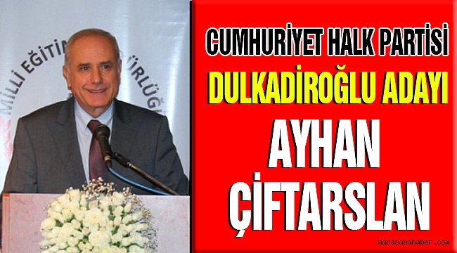Cumhuriyet Halk Partisi (CHP) Dulkadiroğlu Belediye Başkan Adayı Ayhan Çiftarslan oldu.31 Mart yerel seçimlerine 2 ay kala CHP dulkadiroğlu Adayını açıkladı. CHP’nin Dulkadiroğlu Belediye Başkan Adayı eski Vali ayhan Çiftarslan olduğu öğrenildi. Çiftarslan’ın; İYİ Parti’nin Dulkadiroğlu Belediye Başkan Adayı İsmail Karaca’nın çekilmesiyle Millet İttifakı’nın ortak adayı olabileceği ifade edildi.