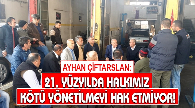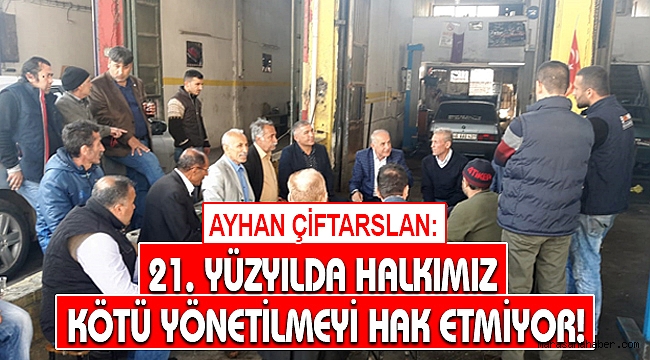 Seçim çalışmalarına ilişkin açıklamalarda bulunan Belediye Başkan Adayı Ayhan Çiftarslan, “Bugün Küçük Sanayi Sitesi’ndeki esnaflarımızı ziyaret ettik. Burada araçlarını yaptıran vatandaşlarımızla sohbet ettik. Hem vatandaşlarımız hem de esnaflarımız yolların bozukluğundan şikâyetçi. Sanayiye rot balans için giren vatandaşların daha sanayiden çıkmadan rot balansı tekrar bozuluyor. Yeni yapılan üst taraftaki dükkânların alt yapısı yok. Biz, vatandaşlarımıza sonuna kadar hak veriyoruz. 21. Yüzyılda halkımız kötü yönetilmeyi hak etmiyor. Vatandaşımıza, esnafımıza bu yollar reva görülemez, görülmemeli” ifadelerine yer verdi.