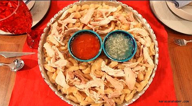Malzemeler: 1 bütün tavuk, 1 adet kuru soğan, 1 çay kaşığı tuz. Hamur için: 5 su bardağı un, yarım su bardağı süt, 1 çay kaşığı tuz, aldığı kadar su. Sa-rımsaklı sos için: 1 su bardağı tavuk suyu, 4 diş sarımsak. Salçalı sos için: 1 su bardağı tavuk suyu, 4 diş sarımsak, 1 yemek kaşığı sıvı yağ, 1 yemek kaşığı tereyağı, 1 yemek kaşığı biber salçası. Hazırlanışı: Tavuk düdüklü tencereye konulduktan sonra üzerine soyulmuş kuru soğan, tuz ve yağ ilave edilerek haşlanır. Diğer yandan süt ılık hale getirilir ve tuz ile birlikte bir kaba alınan unun üzerine ilave edilir. Hamur, kulak memesi yumuşaklığında olacak şekilde su eklenir ve yoğrulur. Hamur küçük parçalar halinde koparıldıktan sonra parmak uçları ile ince bir şekilde yuvarlanarak şekil verilir. Hamur parçaları kurumaması ve yapışmaması için unlanır ve bir tepsiye dizilir. Haşlanan tavuk küçük parçalara didiklenir. Şekil verilmiş hamur parçaları isteğe göre ya tavuğun haşlama suyunda yada önceden hazırlanan sıcak suda 5-10 dakika hafif karıştırılarak haşlanır ve kevgirle başka bir tepsiye alınır. Üzerine didiklenmiş tavuk parçaları serpilir. Sarımsaklar havanda dövüldükten sonra 2 eşit miktarda 2 kaseye konur. Birinin üzerine tavuk suyu eklenerek sarımsaklı sos oluşturulur. Biber salçası, sıvı yağ ve tereyağı kızdırıldıktan sonra üzerine tavuk suyu eklenip bir miktar daha kaynatılır. Diğer kasedeki sarımsağın üzerine ilave edilerek salçalı sos oluşturulur. Her iki kasede tepsinin ortasına konularak servis edilir.Kaynak : Kahramanmaraş ansiklopedisi