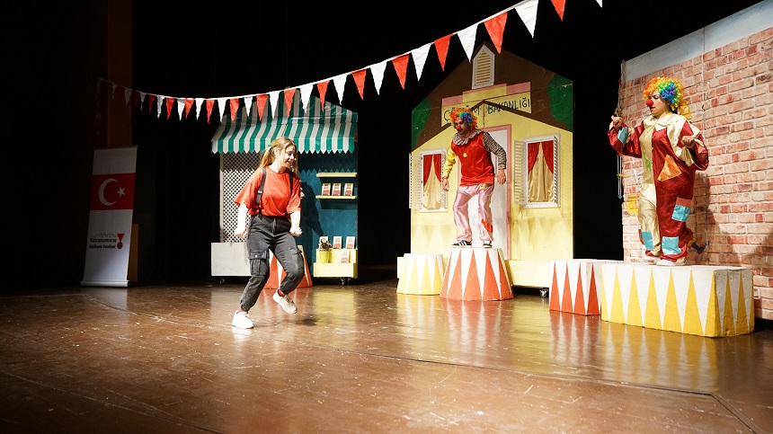 Sahne Maraş Tiyatro Okulu oyuncuları tarafından sergilenen gösteri, minik izleyiciler tarafından büyük bir ilgiyle karşılandı.Eğlenceli ve Öğretici Gösteri