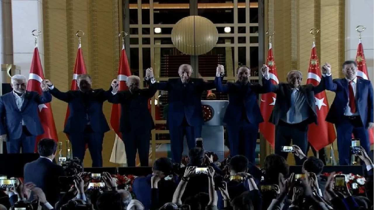 Cumhurbaşkanı Erdoğan'ın konuşmasının sonunda Cumhur İttifakı'nı oluşturan partilerin liderleri "Beraber yürüdük biz bu yollarda" şarkısı eşliğinde kürsüye takdim edildi. Cumhurbaşkanı Erdoğan, liderlerle birlikte el ele tutuşarak, Beştepe'deki vatandaşları selamladılar.
