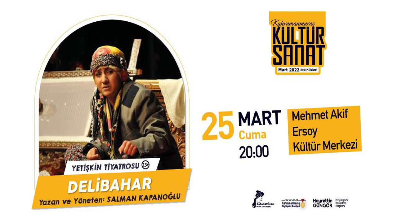 Büyükşehir Belediyesi Mart Kültür Sanat Etkinlikleri kapsamında 25 Mart Cuma günü ‘Delibahar’ adlı tiyatro sahnelenecek. Mehmet Akif Ersoy Kültür Merkezi’nde gerçekleştirilecek etkinlik saat 20.00’da başlayacak.