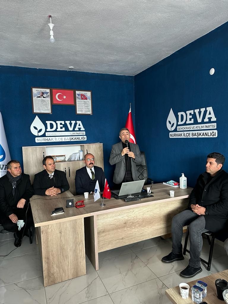 Daha sonra söz alan Deva Partisi Nurhak Belediye Başkan Adayı Avukat Hüseyin TANK ise vatandaşlara hitaben yaptığı toplantıda şunları söyledi:" Bizler Nurhak’ın alması gereken ama bir türlü alamadığı hizmetleri yerine getirmek üzere Nurhak’ın yerel yönetimine talip olan bir yol yürüyoruz. Bu yolun hayırlı ve çok değerli olduğunu düşünüyoruz. Bu yolda bizlere destek veren, yürüdüğümüz yolun doğru olduğuna inanan ve bizleri bu anlamda yalnız bırakmayan tüm Nurhaklıların her birinin sunduğu desteğin çok kıymetli olduğunu vurgulamak istiyorum. Nurhak’ta aksayan demokratik teammüllerin yok edilmesine karşı ne yapabiliriz diye düşündüğümüzde, dayatmaya ve tahakküme karşı çıkan Nurhaklılarla birlikte, birilerinin ben istedim ve yaptım, bu iş böyle olacak dayatmasına karşı gelirken kendimize yeni bir demokratik yol belirledik.
