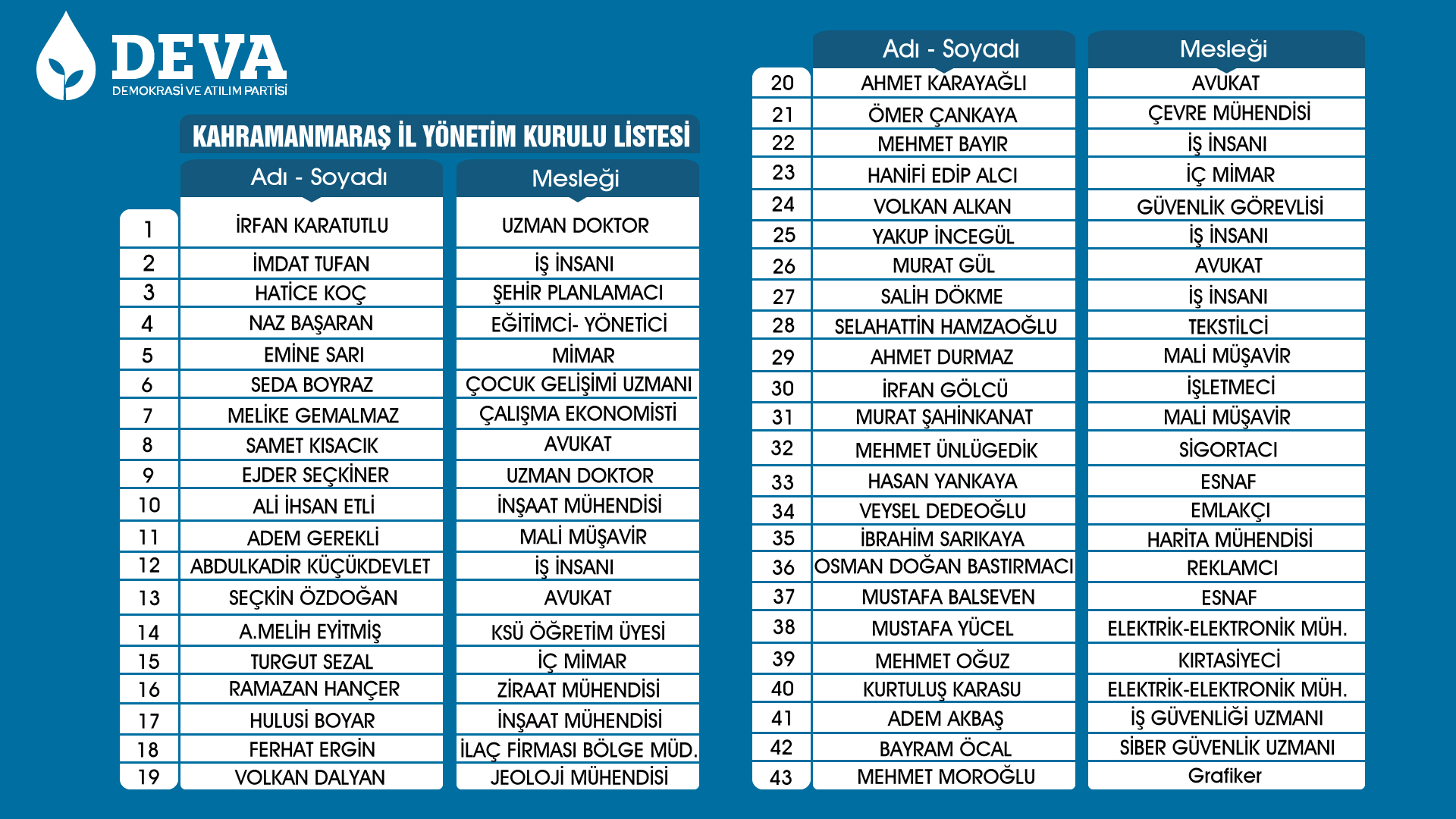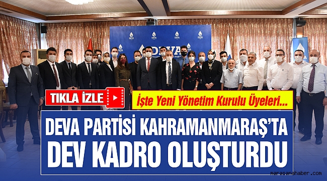 İŞTE DEV KADRO!Deva Partisi Kahramanmaraş İl Yönetim Kurulu Üyeleri ise şu isimlerden oluştu: “İrfan Karatutlu (Uzman Doktor), İmdat Tufan (İş İnsanı), Hatice Koç (Şehir Planlamacı), Naz Başaran (Eğitimci- Yönetici), Emine Sarı (Mimar), Seda Boyraz (Çocuk Gelişimi Uzmanı), Melike Gemalmaz (Çalışma Ekonomisti), Samet Kısacık (Avukat), Ejder Seçkiner (Uzman Doktor), Ali İhsan Etli (İnşaat Mühendisi), Adem Gerekli (Mali Müşavir), Abdulkadir Küçükdevlet (İş İnsanı), Seçkin Özdoğan (Avukat), A.Melih Eyitmiş (KSÜ Öğretim Üyesi), Turgut Sezal (İç Mimar), Ramazan Hançer (Ziraat Mühendisi), Hulusi Boyar (İnşaat Mühendisi), Ferhat Ergin (İlaç Firması Bölge Müdürü), Volkan Dalyan (Jeoloji Mühendisi), Mehmet Moroğlu (Grafiker), Ahmet Karayağlı (Avukat), Ömer Çankaya (Çevre Mühendisi), Mehmet Bayır (İş İnsanı), Hanifi Edip Alcı (İç Mimar), Volkan Alkan (Güvenlik Görevlisi), Yakup İncegül (Müteahhit), Murat Gül (Avukat), Salih Dökme (İş İnsanı), Selahattin Hamzaoğlu (Tekstilci), Ahmet Durmaz (Mali Müşavir), İrfan Gölcü (İşletmeci), Murat Şahinkanat (Mali Müşavir), Mehmet Ünlügedik (Sigortacı), Hasan Yankaya (Esnaf), Veysel Dedeoğlu (Emlakcı-İşletmeci), İbrahim Sarıkaya (Harita Mühendisi), Osman Doğan Bastırmacı (Reklamcı-Radyo Dj), Mustafa Balseven (Esnaf), Mustafa Yücel (Elektrik-Elektronik Mühendisi) Mehmet Oğuz (Kırtasiyeci), Kurtuluş Karasu (Elektrik-Elektronik Mühendisi), Adem Akbaş (Göç İdaresi Uzmanı), Bayram Öcal (Siber Güvenlik Uzmanı).”