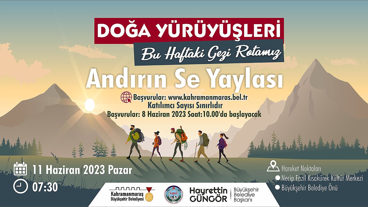 Büyükşehir’in Doğa Yürüyüşleri’nin bu haftaki rotası Andırın Se Yaylası olacak. 11 Haziran Pazar günü gerçekleştirilecek yürüyüşe başvurular, 8 Haziran Perşembe günü saat 10.00 itibariyle Büyükşehir’in internet adresinden yapılabilecek.