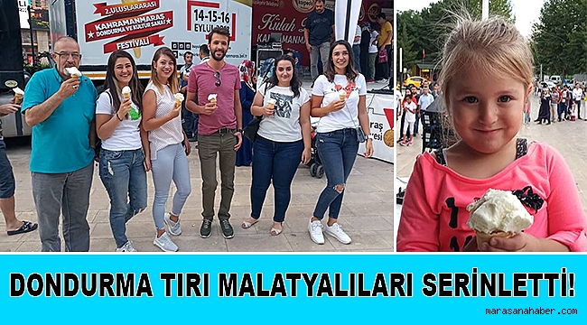 2. Uluslararası Kahramanmaraş Dondurma ve Kültür Sanat Festivali kapsamında Türkiye turuna çıkan dondurma tırı, birçok şehirde vatandaşlara Maraş Dondurmasını tanıtmayı başardı. Kuzey Kıbrıs Türk Cumhuriyeti’nden Alanya’ya, Manisa’dan Elazığ’a kadar birçok ili gezen dondurma tırı dün Malatya’da vatandaşlara Maraş Dondurmasını tanıttı.Malatya'da yoğun ilgiyle karşılaşan dondurma tırı, yüzlerce Malatyalı vatandaşa dondurma ikramında bulundu.