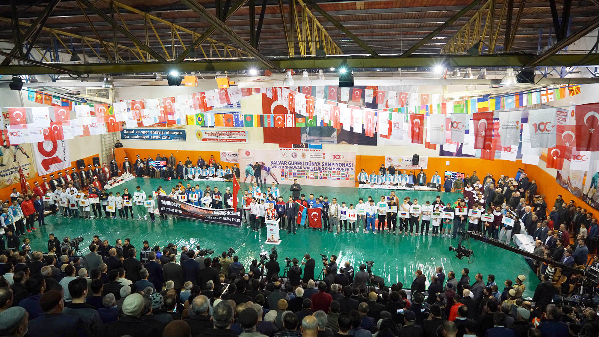 Güreşte Ecdadımızın Cesaretini GörüyoruzŞampiyonada bir konuşma yapan Kahramanmaraş Büyükşehir Belediye Başkanı Hayrettin Güngör, ata sporu güreşin tarihinin çok eskilere dayandığını ifade ederek: “ETNO Spor Konfederasyonu ve Geleneksel Spor Dalları Federasyonu işbirliği ile gerçekleştirdiğimiz Şalvar Güreşi Dünya Şampiyonası’nın, Milli Mücadele’nin 100. Yılı Kutlama Etkinlikleri kapsamında yapılması, hususi bir anlam ve öneme sahiptir. Ata sporumuz güreşte, ecdadımızın cesaretini, “mazlumun yanında, zalimin de karşısında duran” yiğitliğini görmek mümkündür. Kahramanmaraş’ta güreş müsabakaları 17 yıldır turnuva ve festival şeklinde gerçekleştiriliyordu. Biz bunu 100. Yıla özel Dünya Şampiyonasına dönüştürdük. ETNO Spor Konfederasyonu ve Geleneksel Spor Dalları Federasyonu’na, bu ortak çalışmadan dolayı teşekkür ederim. Şampiyonaya Azerbaycan, Brezilya, Bosna-Hersek, Hindistan, Arnavutluk, Kırgızistan, Pakistan, Rusya, İran, Kazakistan, Özbekistan, Japonya, Kanada gibi 46 farklı ülkeden 300 sporcu katılıyor. Dünyanın dört bir yanından gelen sporcularımızı, Kahramanmaraş’ta misafir etmekten sevinç duyuyoruz. Bu yılın diğer bir farkıysa, Altın Kemerli Kırkpınar Başpehlivanı İsmail Balaban’ın aramızda bulunması, ayrıca müsabakalara katılacak olmasıdır” diye konuşarak şampiyonaya katılan tüm güreşçilere başarılar diledi.Açılış konuşmalarının ardından Vali Özkan, Federasyon Başkanı Kazancı ve Büyükşehir Belediye Başkanı Güngör’e hilkat giydirildi.Seremoni sonrası final güreşleri başladı ve dereceye girenlere madalya ve ödülleri verildi.Kahramanmaraş Valisi Vahdettin Özkan, AK Parti Milletvekilleri Ahmet Özdemir, İmran Kılıç, Cihat Sezal, İl Başkanı Ömer Oruç Bilal Debgici, Türkiye Geleneksel Spor Dalları Federasyonu Başkanı Dr. Hakan Kazancı ile belediye başkanları ve binlerce güreşseverin izlediği Şalvar Güreşi Dünya Şampiyonası 8 sıklette gerçekleştirildi. Şampiyonada kilolarında dereceye girenler şu isimler oldu:55 kilo 1. Ahmet Çınar, 2. Muhammed Tasdelen, 3 Bahri Söyler.60 kilo 1.Mıntul Laev, 2.Ali Gürsoy, 3.İsmail Tuluev65 kilo 1.Rahman Rahimpoor, 2. Mujlim Mektıhanov, 3.Adem Dzhembulatov70 kilo 1.Ertuğrul Kaveci, 2.Rıza Mucthader, 3.Shamil Akmedov75 kilo 1. Hasan Kaya, 2. Esat Ardıç, 3. Hamid Elahyan80 kilo 1.Nuri Temur, 2. Adam Khasiev, 3.Ali Reza Keshavarz90 kilo 1. Akbar Sobranimimch, 2. Seza Arslan, 3. Atilla Kaan Aydın90+ Kilo 1. İsmail Balaban, 2. Ömer Yavuz, 3. Adam Daulbekov