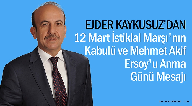 Dulkadiroğlu Bağımsız Belediye Başkan adayı Ejder Kaykusuz, 12 Mart İstiklal Marşı'nın Kabulü ve Mehmet Akif Ersoy'u Anma Günü nedeniyle yaptığı açıklamada; “İstiklal Marşı bir Milletin bağımsızlık aşkının, imkânsızlıklar içerisinde gösterdiği büyük kahramanlığın, azim ve fedakârlıkla verilen kurtuluş mücadelesinin mısralara dökülmüş ifadesidir.” dedi.