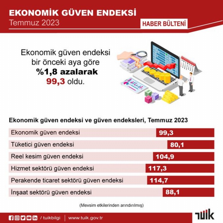 Bir önceki aya göre Temmuz ayında tüketici güven endeksi yüzde 5,9 oranında azalarak 80,1 değerini, reel kesim (imalat sanayi) güven endeksi yüzde 0,8 oranında azalarak 104,9 değerini, hizmet sektörü güven endeksi yüzde 0,6 oranında azalarak 117,3 değerini, perakende ticaret sektörü güven endeksi yüzde 2,6 oranında azalarak 114,7 değerini, inşaat sektörü güven endeksi yüzde 0,9 oranında azalarak 88,1 değerini aldı.