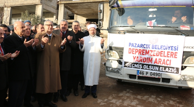 Geçtiğimiz günlerde merkez üssü Sivrice olan 6,8 şiddetindeki Elazığ depreminin ardından ilçesinde depremzedeler için yardım kampanyası başlatan Pazarcık Belediye Başkanı İbrahim Yılmazcan, yardım aracını Diyanet İşleri Başkanı Ali Erbaş’ın da katıldığı törende dualarla yolcu etti.Elazığ’da medyana gelen depremin ardından bölgeye giderek depremzedeleri ziyaret eden Pazarcık Belediye Başkanı İbrahim Yılmazcan, ilçesine döne dönmez depremzeler için yardım kampanyası düzenledi.Pazarcık halkının da ilgi gösterdiği kampanya sonucu toplanan yardımlar, Diyanet İşleri Başkanı Ali Erbaş, TBMM İçişleri Komisyon Başkanı Celalettin Güvenç, Ak Parti kahramanmaraş Milletvekilleri İmran Kılıç, Habibe Öçal, Pazarcık İlçe Kaymakamı Adil Nas, İl Müftüsü Celal Sürgeç, Belediye Başkanı İbrahım Yılmazcan ve yoğun katılımın olduğu törenle yola çıktı.Pazarcık’tan Elazığ’a doğru yola çıkan yardım kamyonu için Diyanet İşleri Başkanı Ali Erbaş dua etti.