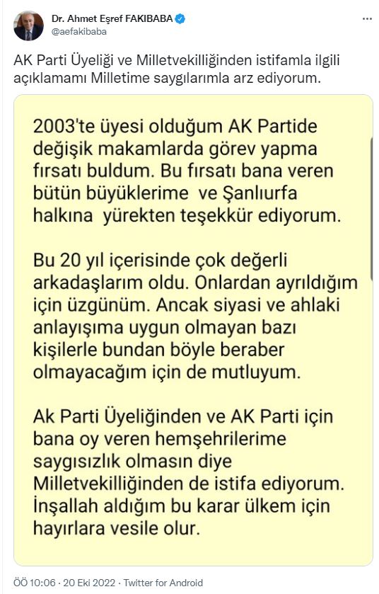 Sosyal medya hesabından istifa kararını duyuran Şanlıurfa Milletvekili Ahmet Eşref Fakıbaba, “Siyasi ve ahlaki anlayışına uygun olmayan kişilerle bundan sonra beraber olmayacağı için mutlu olduğunu” ifade etti.