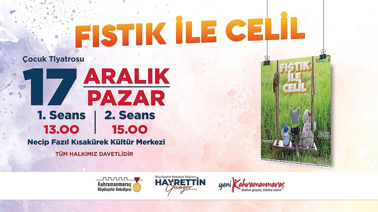 Sosyal belediyecilik çerçevesinde çocuklara yönelik kurs, atölye ve faaliyetlerini aralıksız sürdüren Kahramanmaraş Büyükşehir Belediyesi, 17 Aralık Pazar günü ‘Fıstık ile Celil’ adlı tiyatro gösterisini miniklerle buluşturacak. Necip Fazıl Kısakürek Kültür Merkezi’nde sahnelenecek gösteri, saat 13.00 ve 15.00’da iki seans olarak kapılarını minik tiyatroseverlere açacak. İçine kapanık bir çocuk olan Celil’in Fıstık ismini verdiği kuklayı kendine arkadaş edinmesini ve devamında gelişen olayları konu alan gösteri, çocuklara dostluk ve arkadaşlığın önemini de anlatacak. Büyükşehir Belediyesinden yapılan açıklamada, ücretsiz olarak sahnelenecek gösteriye tüm çocukların davetli olduğu belirtildi.