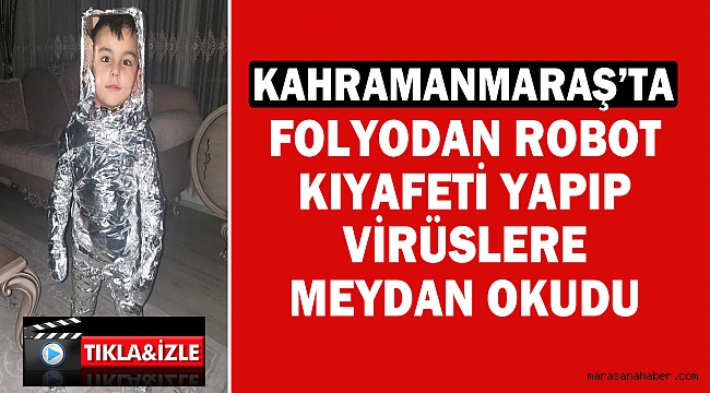 Folyodan yaptığı robot kıyafetiyle virüslere meydan okuyan küçük Eymen, maskesiz sokağa çıkan insanlara örnek oldu.