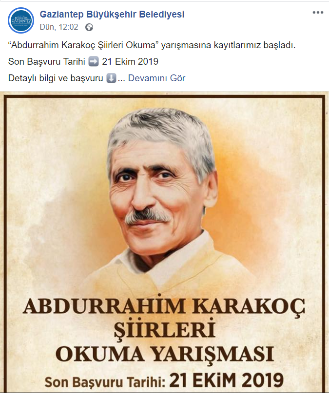 Geçtiğimiz haftalarda gaziantep Büyükşehir Belediye Başkanı Fatma Şahin’in Maraş Biberini sahiplenerek kullandığı “Antep biberi” ifadesinin gündeme bomba gibi düşmesinin ardından gaziantep büyükşehir belediyesi bir değerimize daha sahip çıktı. Gaziantep Büyükşehir Belediyesi, Kahramanmaraş’ın yetiştirdiği ve Türk Edebiyatı’nın ünlü şairi Abdurrahim Karakoç adına şiir okuma yarışması düzenliyor.