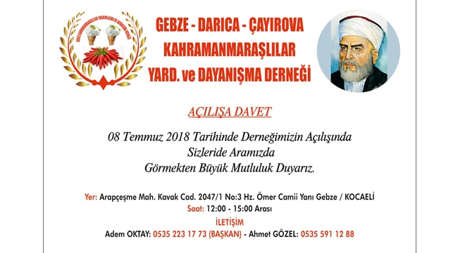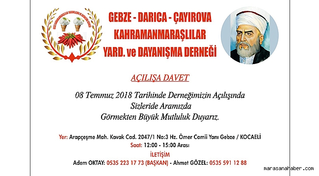 Geçtiğimiz aylarda Kocaeli ilinin Gebze ilçesinde yaşayan Kahramanmaraşlıların kurduğu Gebze Kahramanmaraşlılar Derneği, 8 Temmuz Pazar günü açılıyor.
