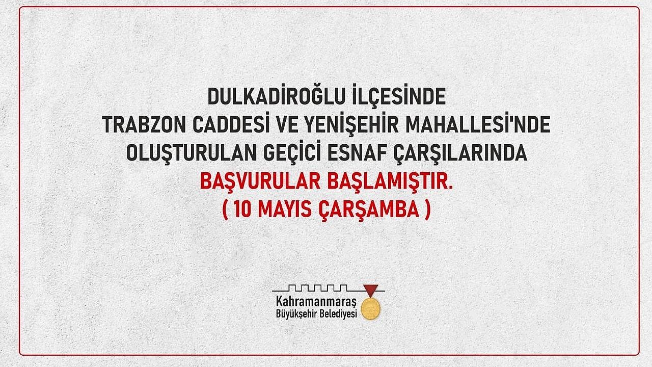 Şehrin yeniden imarı, hayatın normale dönmesi, ticaretin canlanması ve depremde iş yerleri hasar alan esnafların faaliyetlerini sürdürmesi noktasında çalışmalarını kesintisiz sürdüren Kahramanmaraş Büyükşehir Belediyesi, Dulkadiroğlu ilçesinde Trabzon Caddesi’ne inşa edilen Müftülük Çarşısı ile Yenişehir Mahallesi’nde oluşturulan Sakarya Büyükşehir Çarşısı’nda başvuruların başladığını duyurdu. Geçici çarşılarda iş yeri sahibi olmak isteyen esnaflar, 10 Mayıs Çarşamba gününe kadar Büyükşehir Belediyesi Ana Hizmet Binası’nda bulunan Ticaret ve Sanayi Dönüşüm Ofisi’nden bizzat veya Büyükşehir Belediyesi’nin internet sitesinden çevrimiçi başvuru yapabilecek. Toplamda 112 iş yerinden oluşan geçici çarşılara başvuru şartlarına ilişkin detaylı bilgiye Büyükşehir Belediyesi’nin internet sitesinde duyurular bölümünden ulaşılabiliyor.
