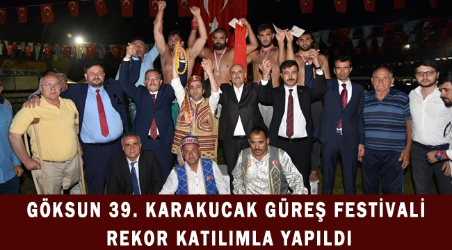 Göksun Belediyesi tarafından 39’uncusu düzenlenen Karakucak Güreş Festivali, 3 ülke ve 46 ilden 60’ı başpehlivan olmak üzere toplam 712 pehlivanın katılımı ile 4 gurupta 22 sıklette gerçekleştirildi.Alparslan Türkeş Mesire Alanı çim sahada geç saatlere kadar devam eden göksun 39. Karakucak Güreş Festivalinde Kahramanmaraşlı milli güreşçi Enes Bandırma başpehlivan oldu.Göksun Belediye Başkanı Hüseyin Coşkun Aydın, Göksun’un dünya çapında yetiştirdiği pehlivanları, tarihi geçmişi 60 yıl öncesine dayanan ve ülkemizin önemli festivalleri arasında yer alan Karakucak Güreş Festivali nedeniyle ‘Pehlivanlar Diyarı’ olarak anılan bir ilçe olduğunu söyledi.Karakucak güreşlerinin Türklerin öz ve milli sporlarından olduğuna işaret eden Başkan Aydın, şunları kaydetti:“Tarihi mirasımız içinde yer alan karakucak güreşleri ilçemizde önemli bir yere sahiptir. Millet olarak bizim en önemli hasletlerimizden biri de hiç kuşkusuz tarihimize, kültürümüze, ananelerimize ve örfümüze bağlı olmamızdır. Orta Asya Türk toplumlarından itibaren aslına uygun olarak icra edilen Karakucak Güreşleri de Türklerin öz ve milli sporlarından sadece birisidir. Pehlivanlar Diyarı olarak anılan Göksun, dünya çapında yetiştirdiği pehlivanları, tarihi geçmişi 60 yıl öncesine dayanan ve ülkemizin önemli festivalleri arasında yer alan karakucak güreş festivali ile ata sporumuza hizmet eden bir ilçedir.”Başkan Aydın, Göksunlu güreşçilerin, ulusal ve uluslarası müsabakalarda Göksun’u ve ülkemizi başarı ile temsil ettiklerini ve Göksun’un tanıtımına önemli katkılar sundukları kaydetti.Festivalde, AK Parti Kahramanmaraş Milletvekili İmran Kılıç, AK Parti Kahramanmaraş İl Başkanı Ömer Oruç Bilal Debgici, kahramanmaraş büyükşehir belediye başkanı fatih mehmet erkoç ve Göksun Kaymakamı Hüseyin Aydın bir konuşma yaptı.Göksun Karakucak Güreşleri ile Göksun 39. Karakucak Güreş Festivali’ne katkı sağlayanlar plaketle ödüllendirildi.Göksun 39. Karakucak Güreş Festivali ağalığı için yapılan açık artırma sonunda İşadamı Zafer Gül, Güreş Ağası oldu.Geç saatlere kadar devam eden Göksun 39. Karakucak Güreş Festivalinde Enes Bandırma (Kahramanmaraş) başpehlivan olurken, Fatih Kambur (Amasya) ikinci, Salim Ercan (Sivas) ve Eren Dursun Turan (Erzurum) üçüncü oldu.Diğer kategorilerde dereceye giren pehlivanlar şu isimler olduMinikler Kategorisi:30 kiloda Şahin Acar birinci olurken, Müslüm Şimşek ikinci, Sefa Gürhan ve Mertcan Bilir üçüncü oldu.35 kiloda Resul Doğan birinci olurken, Bekir Keser ikinci, Ali Korkmaz ve Ali Ütük üçüncü oldu.40 kiloda İbrahim Yaprak birinci olurken, İsmail Söyle ikinci, Ümmet Gökdemir ve Sezgin Koşar üçüncü oldu.45 kiloda Emirhan Gizir birinci olurken, Batuhan Böke ikinci, Melih Gümüş ve Halit Kuyucu üçüncü oldu.50 kiloda Barış Ünsal birinci olurken, Ahmet Kalın ikinci, Ömer Baki Şahin ve Ferhat Yiğit üçüncü oldu.55 kiloda B. Talip Öveç birinci olurken, Abdulkadir Çil ikinci, Buğra Aybaş ve Muhammet Karadoğaner üçüncü oldu.Yıldızlar Kategorisi:45 kiloda Mücahit Yılmaz birinci olurken, Bahri Söyler ikinci, Kadir Duman ve Harun Efe Gökçe üçüncü oldu.50 kiloda Halil Gökdeniz birinci olurken, Metehan Karabıyık ikinci, Ömer Ertuğrul ve Yusuf Eryüce üçüncü oldu.55 kiloda Süleyman Konak birinci olurken, Emre Şahin ikinci, Furkan Ertürk ve Orhan Çam üçüncü oldu.60 kiloda Ahmet Gizir birinci olurken, Muhammet Güle ikinci, Yasin Sever ve Tahsin Çetin üçüncü oldu.65 kiloda Hamza Alaca birinci olurken, Harun Söyler ikinci, Mevlit Özdemir ve Mustafa Taryaldız üçüncü oldu.70 kiloda Hasan Doğan birinci olurken, Halit Özmuş ikinci, Şahan Acar ve Esad Ardıç üçüncü oldu.80 kiloda Ahmet Doğan birinci olurken, Serhat Binicitürk ikinci, Denizhan Çırak ve Tayfur Alkız üçüncü oldu.85-100 kiloda Yusuf Durhan birinci olurken, Buğrahan Arduk ikinci, Can Bayram ve Ahmet Böke üçüncü oldu.Büyükler Kategorisi:55 kiloda Emre Demircan birinci olurken, Engin Çetin ikinci, Ahmet Çınar ve Mahini Maratzade üçüncü oldu.60 kiloda Ahmet Taş birinci olurken, Ali Karaboğa ikinci, Celan Süleymanov ve Şaban Kızıltaş üçüncü oldu.65 kiloda Ali Çam birinci olurken, Ertuğrul Kahveci ikinci, Seymur Cebrailov ve Mustafa Kartal üçüncü oldu.70 kiloda Sefa Aksoy birinci olurken, Selahattin Kılıçsallayan ikinci, Ömer Çomruk ve Hasan Kaya üçüncü oldu.75 kiloda Şenol Çalık birinci olurken, Aslen Grev ikinci, Uğur Çadır ve Ali Kurt üçüncü oldu.80 kiloda Musa Gürbüz birinci olurken, Kadir Özmen ikinci, Efe Sami Önal ve Lütfi Küçükyıldırım üçüncü oldu.90 kiloda Caner Demirtaş birinci olurken, Süleyman Karadeniz ikinci, Samet Özaslan ve Bekir Demirtaş üçüncü oldu.Güreşleri, AK Parti Kahramanmaraş Milletvekilleri Ahmet Özdemir ve İmran Kılıç, AK Parti İl Başkanı Ömer Oruç Bilal Debgici, Kahramanmaraş Büyükşehir Belediye Başkanı Fatih Mehmet Erkoç, Göksun Kaymakamı Hüseyin Aydın, Nevşehir Acıgöl Kaymakamı Ömer Tuğrul Kundakçı, Göksun Belediye Başkanı Hüseyin Coşkun Aydın, Afşin Belediye Başkanı Fatih Mehmet Güven, Andırın Belediye Başkanı Baki Tezcan, AK Parti Göksun İlçe Başkanı Ufuk Ünal, İçişleri Bakanlığı 112 Acil Çağrı Hizmetleri Şube Müdürü Reşit Gürbüz, eski Dünya ve Avrupa şampiyonu milli güreşçi Şeref Eroğlu ve yaklaşık 4 bin 500 kişi izledi.