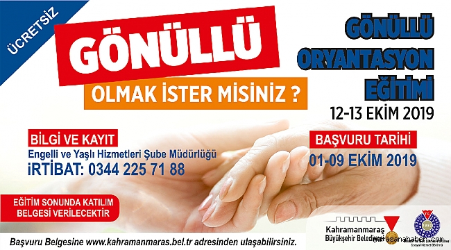 Büyükşehir Belediyesi Gönüllü oryantasyon Eğitimleri başvuruları başladı. 12 ve 13 Ekim’de gerçekleştirilecek eğitimler için 9 Ekim Çarşamba gününe kadar internet üzerinden kayıt yapılabilecek.Kahramanmaraş Büyükşehir Belediyesi Sağlık ve Sosyal Hizmetler Dairesi Başkanlığı ve Sütçü İmam Üniversitesi Sosyal Hizmet Bölümü işbirliğiyle gerçekleştirilecek ‘Gönüllü Oryantasyon Eğitimi’ kayıtları başladı. 12 ve 13 Ekim tarihlerinde düzenlenecek eğitim programı için Büyükşehir Belediyesi internet sitesi üzerinden kayıt yapılabilecek.Kayıtlar İnternet ÜzerindenKonu ile ilgili olarak Engelli ve Yaşlı Hizmetleri Şube Müdürlüğü’nden yapılan açıklamada, “Sütçü İmam Üniversitesi Sosyal Hizmet Bölümü iş birliği ile Gönüllü Oryantasyon Eğitimi programını başlatıyoruz. Bu kapsamda Gönüllülük ve Sivil Toplum, Sosyal Hizmetler ve Sosyal Faaliyet Alanları, İletişim ve Gönüllülük Çalışmalarında İletişim, Duygusal Zeka, Takım Çalışması ve Liderlik, Sosyal Girişimcilik, Sosyal Hizmetlerde Etik ve Mahremiyet ile Sosyal Sorunlar ve Dezavantajlı Gruplar başlıkları altında eğitim verilecek. Kayıtlarımız belediyemiz internet sitesi duyurular kısmındaki ‘gönüllü oryantasyon eğitimi’ linki üzerinden 9 Ekim Çarşamba gününe kadar alınacak. 12 ve 13 Ekim tarihlerinde de eğitimlerimiz gerçekleştirilecek. Detaylı bilgi için 0344 225 71 numaralı telefon aranabilir” ifadeleri kullanıldı.Başvuru için: https://kahramanmaras.bel.tr/haber/2019/10/04/gonullu-olmak-ister-misin