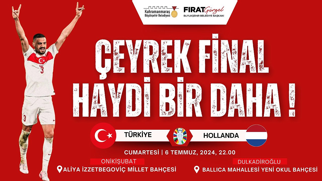 Almanya'da düzenlenen 2024 Avrupa Futbol Şampiyonası'nda A Milli Takımımızın grup maçları ve son 16 turunda oynadığı karşılaşmaları dev ekranlarda futbolseverlerle buluşturan Kahramanmaraş Büyükşehir Belediyesi, şimdi de Millilerimizin çeyrek final heyecanına ortak olacak. Millilerimizin 6 Temmuz Cumartesi günü Hollanda ile oynayacağı zorlu çeyrek final karşılaşması, Onikişubat’ta Aliya İzzetbegoviç Millet Bahçesi'nde ve Dulkadiroğlu’nda Ballıca Mahallesi 11. Sokak’ta bulunan Ballıca İlkokulu bahçesine kurulacak dev ekranlarda canlı olarak izlenebilecek.