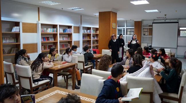 servislerle okullarından alınarak Çocuk Kütüphanesi’ne getirildi. “Okuma Saati”