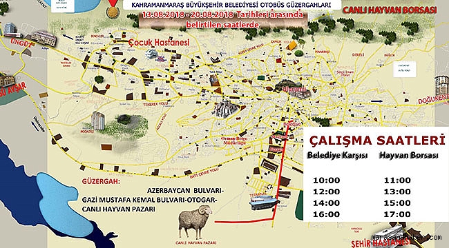 Kahramanmaraş Büyükşehir Belediyesi tarafından geçici süreli olarak çalışacak otobüs hattı 13 Ağustos 2018 Pazartesi günü başlayıp, 20 Ağustos 2018 Pazartesi gününe kadar devam edecek.Kahramanmaraş Büyükşehir Belediyesi karşısındaki duraktan hareket ederek Madalyalı Kavşak’tan Otogar istikametine ve direkt olarak Canlı Hayvan Borsası’na geçecek olan geçici otobüs seferleri 13-20 Ağustos tarihleri arasında hizmet verecek.