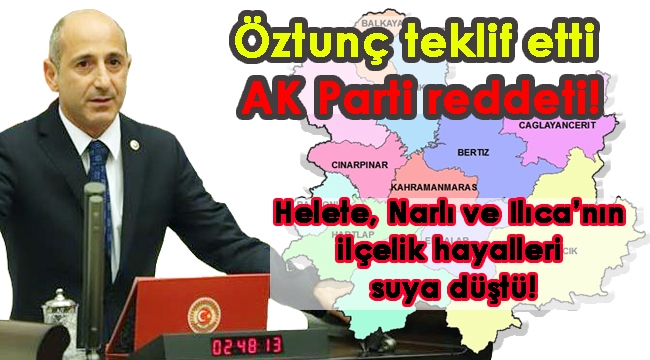 Bu kapsamda, bu önergenin kabul edilmesini -Kahramanmaraş için- Adalet ve Kalkınma Partisine her seçimde kamyon kamyon oy veren, geçmiş seçimlerde, en son bir öncekinde yüzde 72, bu seçimde yüzde 58 oy veren Kahramanmaraşlıların hak ettiğini düşünerek yeni üç ilçenin hayırlı olmasını şimdiden temenni ediyorum. Sayın Başkanıma ve Gaziantep milletvekillerine destekleri için de teşekkür ediyorum. Sağ olun.”KOMİSYONDA ÇOĞUNLUK AKP’NİN ELİNDETBMM İçişleri Komisyonu’nda AKP’den 13, CHP’den 6, HDP’den 3, MHP 2ve İYİ Parti’den ise 2’şer milletvekili görev yapıyor.İLK DEĞİLÇeşitli platformlarda bölge milletvekillerinin nasıl olsa ceketimizi göndersek oy alırız mantığıyla Kahramanmaraş’tan bir haber olduğunu vurgulayan Öztunç, geçtiğimiz hafta TBMM’de yaptığı konuşmada Elbistan’ın il olması için teklif verdiğini hatırlatarak “Seçim zamanında, meydanlarda Elbistan’a gidip ‘Evet, biz de Elbistan’ı il yapacağız’ diyen AK Parti’nin saygıdeğer milletvekilleri, Genel Başkan Yardımcısı Sayın Mahir Ünal, verdiğim kanun teklifine sizden destek bekliyorum. Eğer destek vermezseniz bir daha Elbistan’a gittiğinizde vatandaşlarımız sizleri karşılayacaktır ama olumsuz karşılayacaklardır. Elbistan’ın il olması için sadece AK Parti’den değil, Milliyetçi Hareket Partisinden, Sayın Sefer Aycan’dan da -ki destek verdiğini biliyorum- destek istiyoruz. Lütfen, gelin bu sorunları hep birlikte sona erdirelim” ifadelerini kullanarak hükümet yetkililerini sert bir dille eleştirmişti.TBMM İÇİŞLERİ BAŞKANLIĞI’NCA REDDEDİLEN TEKLİFİN TAM METNİ ŞU ŞEKİLDE: