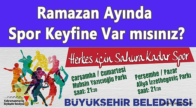 Kahramanmaraş Büyükşehir Belediyesi ilkini geçen yıl gerçekleştirdiği Herkes İçin Sahura Kadar Spor projesi kapsamında etkinlikler yapıyor.Kahramanmaraş Büyükşehir Belediyesi tarafından hem Aliya İzzetbegoviç Parkı’nda hem de Muhsin Yazıcıoğlu Mesire Alanı’nda etkinlikler yapılıyor.Kahramanmaraş Büyükşehir Belediyesi’nce her hafta Çarşamba ve Cumartesi günleri muhsin yazıcıoğlu mesire alanı saat 21.30’da Perşembe ve Pazar günleri de 21.30’da Aliya İzzetbegoviç Parkı’nda basketbol, voleybol, badminton, tenis ve futbol gibi dallarda hem eğitim veriliyor hem de turnuvalar düzenleniyor.Ramazan ayı boyunca devam edecek etkinliklerde hem vatandaşlarımıza spor yapma imkanı hem de vatandaşlar arasında dayanışma ve kaynaşma sağlanmış olacak.