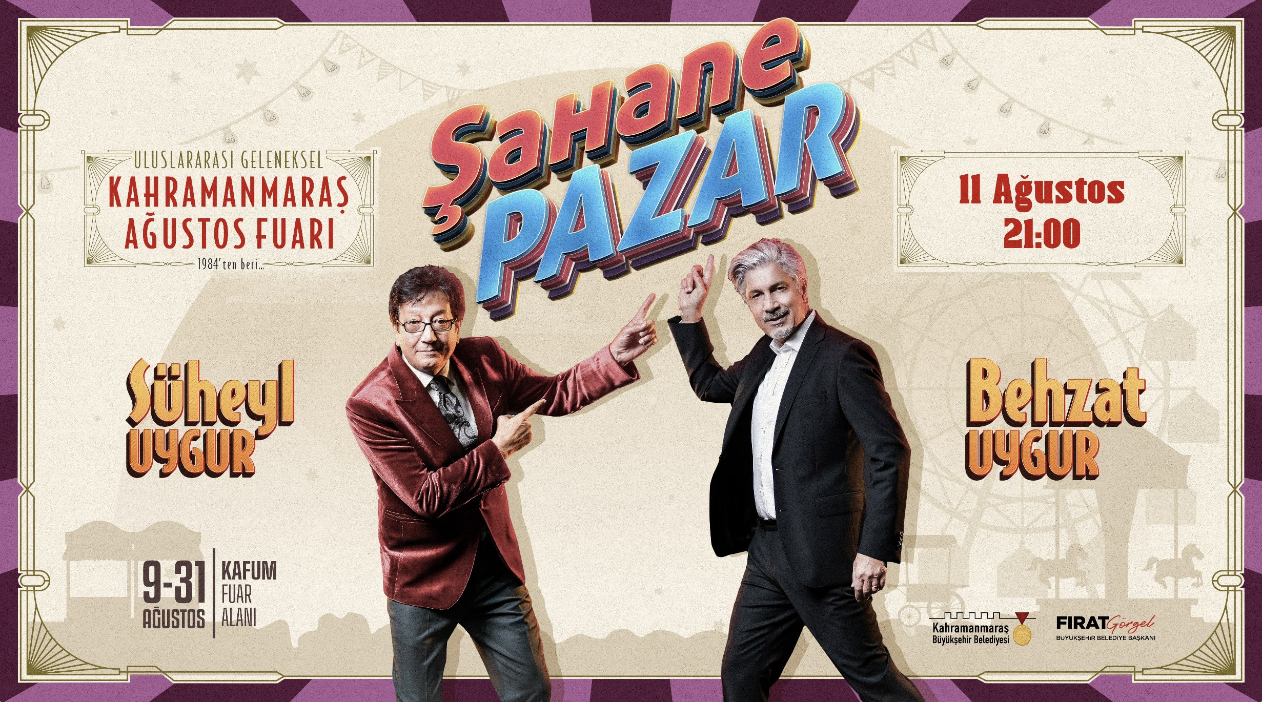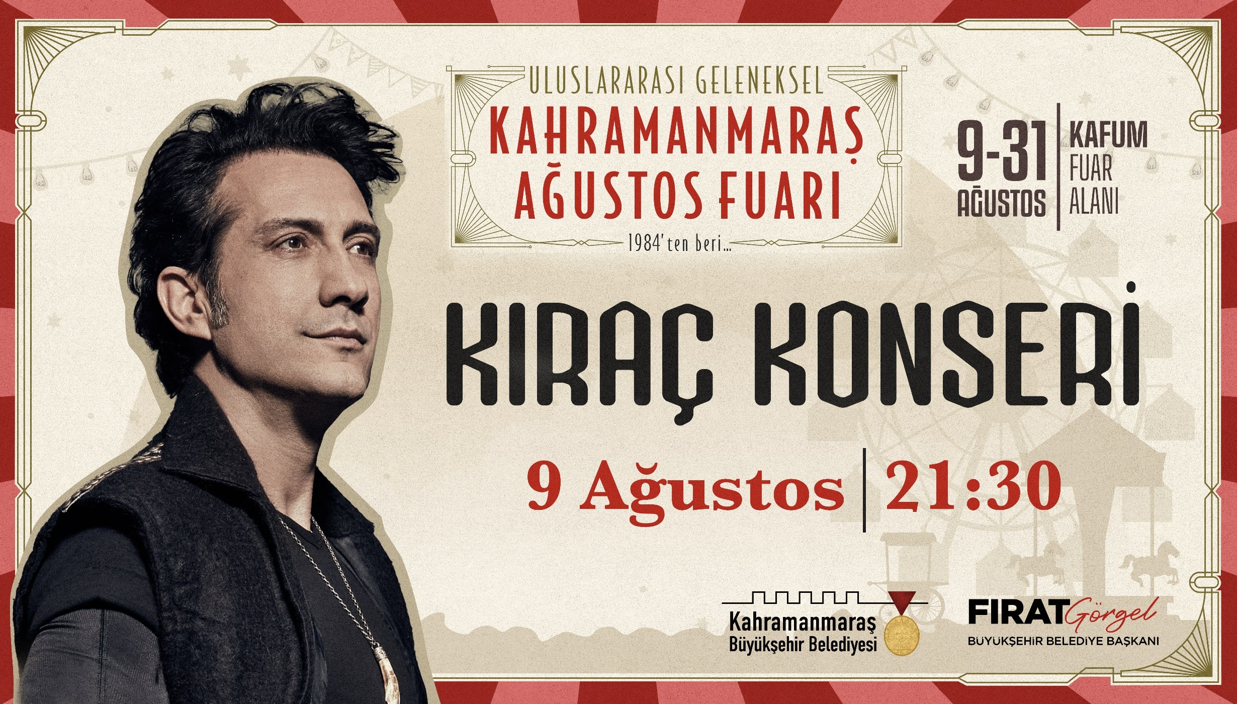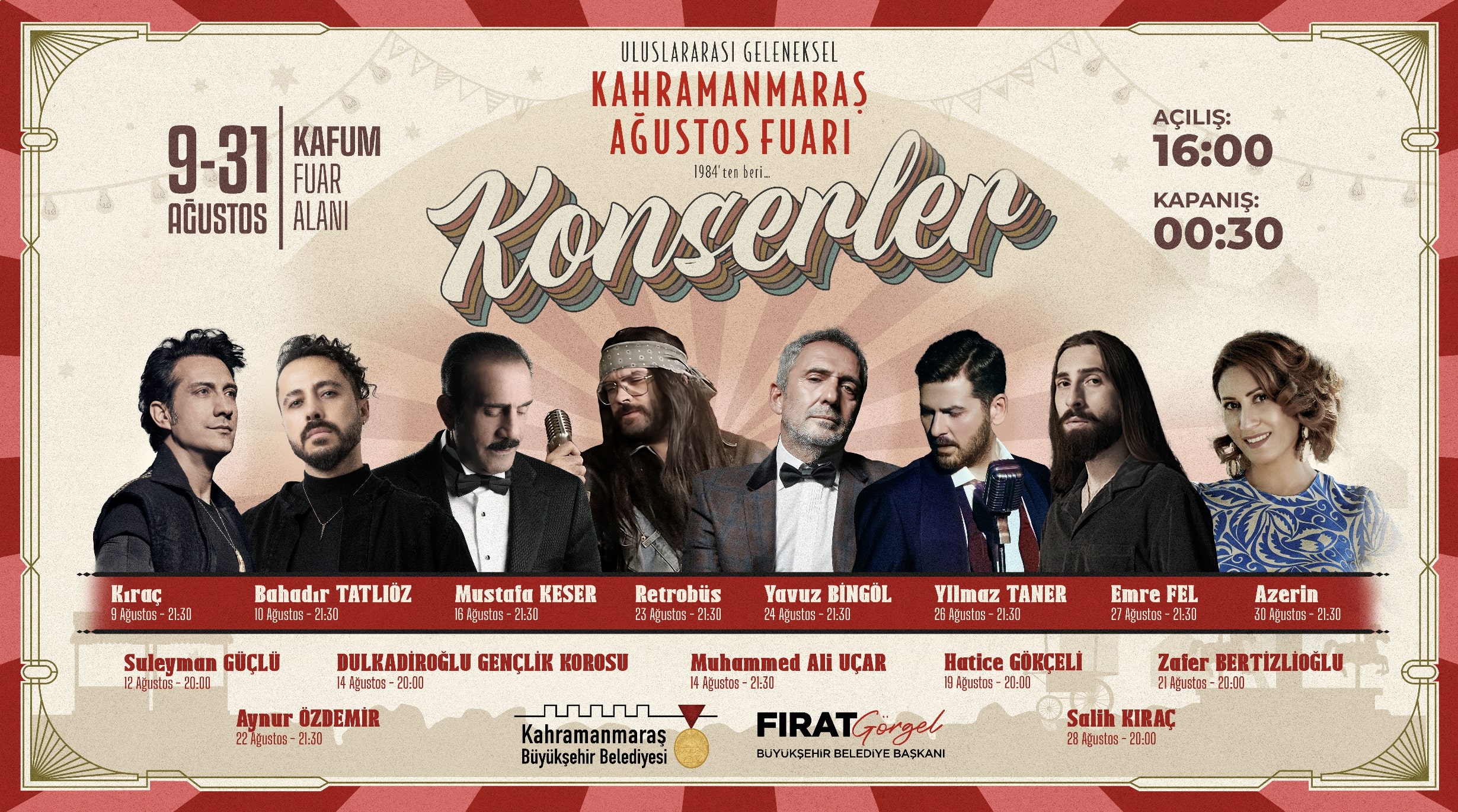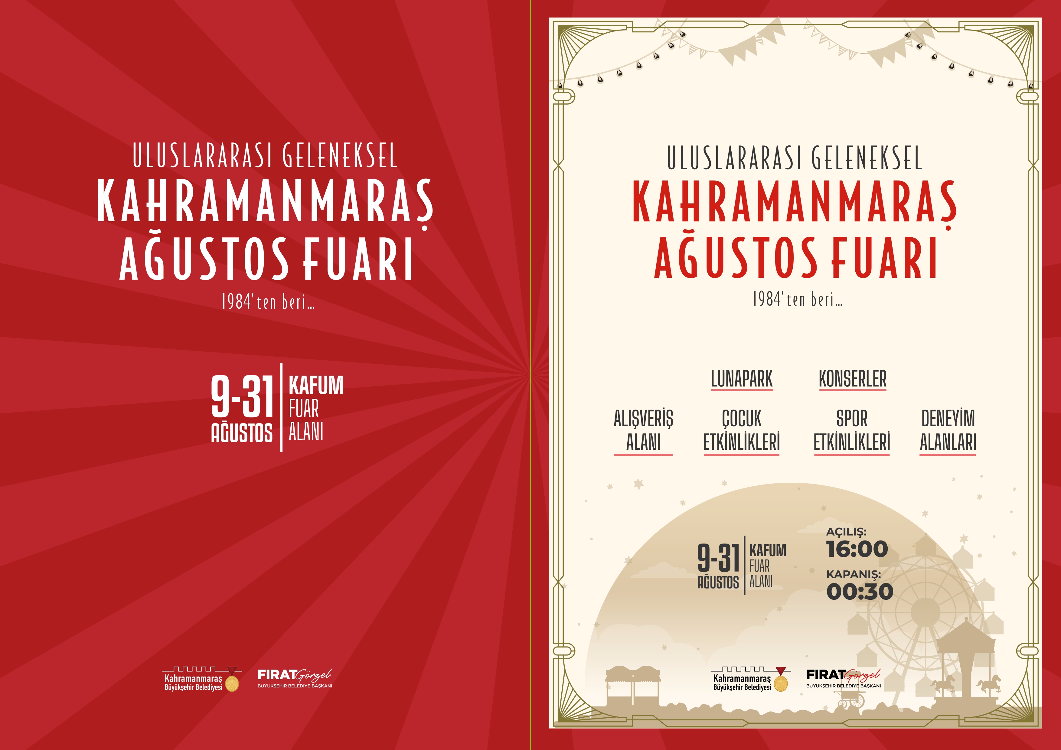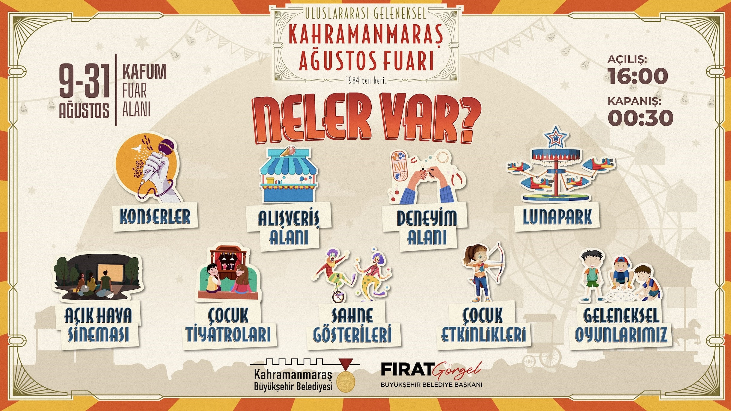 Başkan Fırat Görgel liderliğinde düzenlenen fuar, 9 – 31 Ağustos tarihleri arasında KAFUM Atatürk Parkı’nda gerçekleştirilecek. Yöresel ürünler, hediyelik eşyalar, çocuk etkinlikleri, konserler, yeme-içme alanları, lunapark ve spor etkinlikleri vatandaşlarla buluşacak. Fuarın açılışı, 9 Ağustos Cuma günü saat 21.30’da Kıraç konseri ile yapılacak.