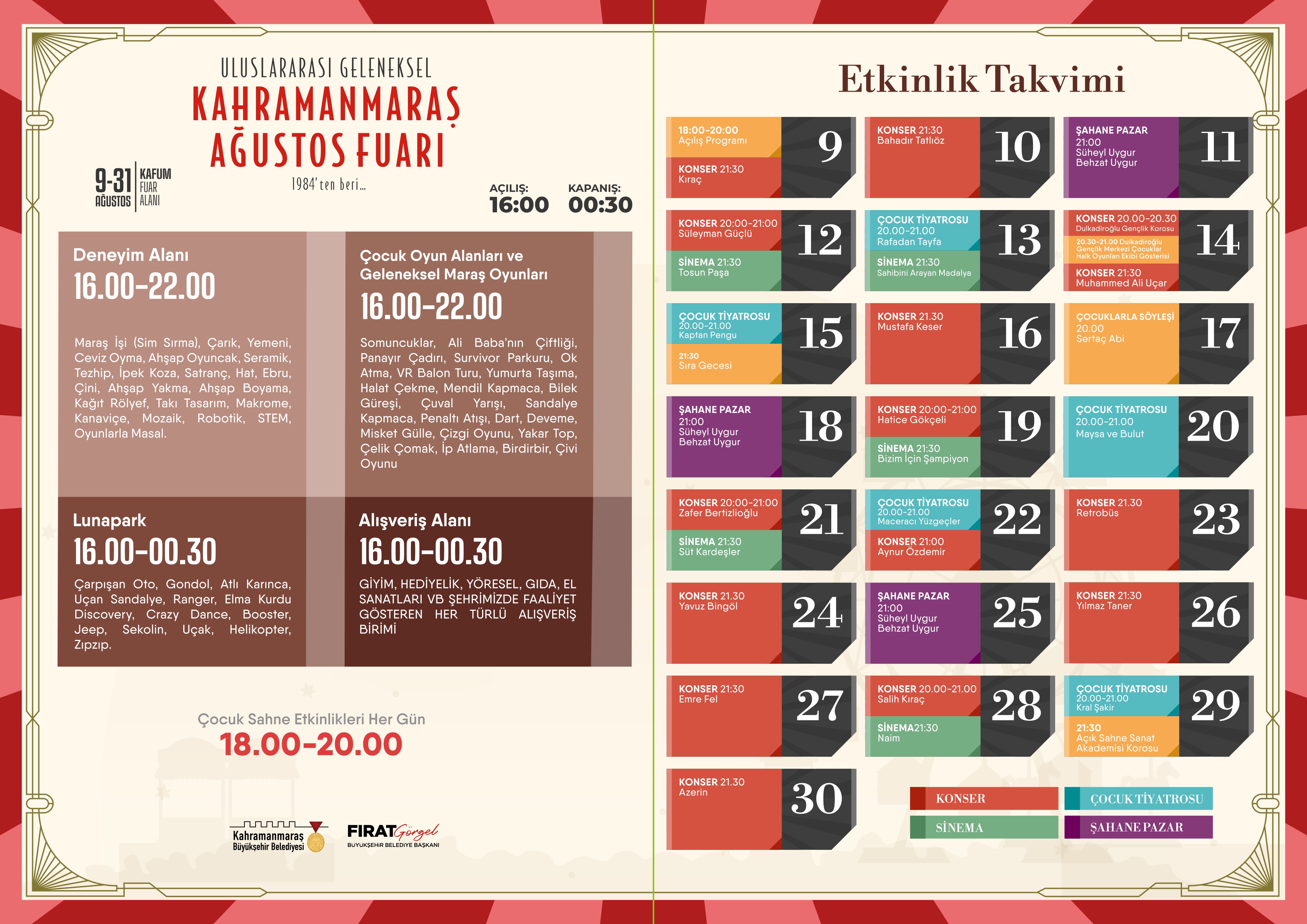 Çocuklar için oyun alanları ve lunaparkta eğlenceli etkinlikler düzenlenecek. Ayrıca, belirli tarihlerde çeşitli gösteriler sahnelenecek:
