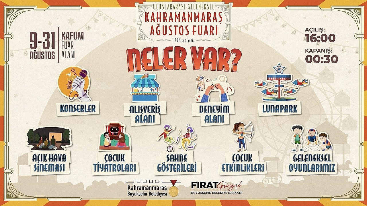 Büyükşehir Belediyesi'nden yapılan açıklamaya göre; Geleneksel Ağustos Fuarı etkinlik takvimine Kahramanmaraş Büyükşehir Belediyesi’nin resmi internet sitesinden ulaşılabilir.