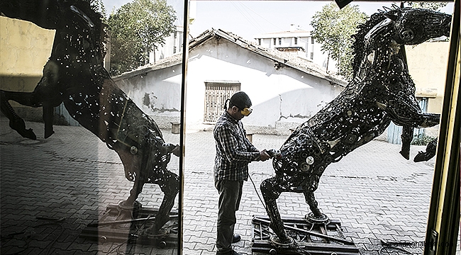 Hurda malzemelerden at heykeli yaptı