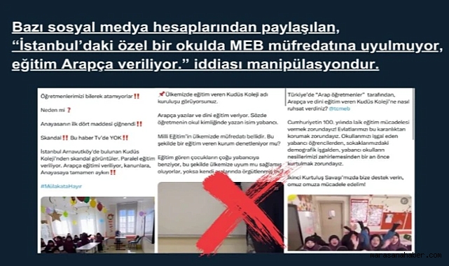 “İstanbul’daki özel bir okulda MEB müfredatına uyulmuyor” iddiasnın manipülasyon içerikli olduğu belirlendi.ANKARA (İGFA) - İletişm Başkanlığı, bazı sosyal medya hesaplarından paylaşılan, “İstanbul’daki özel bir okulda MEB müfredatına uyulmuyor, eğitim Arapça veriliyor.” iddiasıyla ilgili açıklama yaptı.Söz konusu iddiaların manipülasyon olduğunu belirten Başkanlıktan yapılan yazılı açıklamada, "İddiaya konu okul, özel bir okuldur. Ülkemizde 5580 sayılı Kanun kapsamında farklı ülkelere ait programlarla ve yabancı dillerde eğitim veren milletlerarası okullara imkân verilmektedir. Bu okullarda eğitim dili olarak ilgili ülkenin dili veya farklı bir yabancı dil ile eğitim verilebilmektedir. Bahse konu okul da bu kapsamdaki okullardan biridir. Kamuoyunu provoke etmeye yönelik asılsız iddialara itibar etmeyiniz" ifadeleri yer aldı.