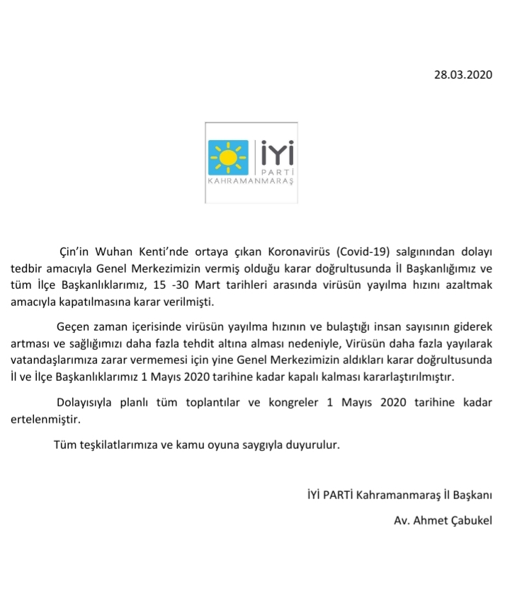 İYİ Parti Genel Merkezi, Koronavirüs salgını kapsamında alınan tedbirler doğrultusunda il ve ilçe başkanlıkları 1 Mayıs’a kadar kapatıldı. Küresel bir tehdit haline gelen Koronavirüs salgınının yayılımını engellemek için siyasi partiler il ve ilçe başkanlıklarını kapatmıştı. Virüsün yayılımını engellemek için alınan tedbirler doğrultusunda daha önce 15-30 Mart tarihleri arasında il ve ilçe başkanlıklarını kapatma kararı alan İYİ Parti Genel Merkezi, bu süreyi 1 Mayıs’a kadar uzattı.Konuyla ilgili açıklama yapan İYİ Parti kahramanmaraş İl Başkanı Av. Ahmet Çabukel, il ve ilçe başkanlıklarıyla beraber planlı tüm toplantı ve kongrelerin 1 Mayıs tarihine kadar ertelendiğini duyurdu.Çabukel, açıklamasında şu ifadelere yer verdi: “Çin'in Wuhan Kenti'nde ortaya çıkan Koronavirüs (Covid-19) salgınından dolayı tedbir amacıyla Genel Merkezimizin vermiş olduğu karar doğrultusunda İl Başkanlığımız ve tüm ilçe Başkanlıklarımız, 15 -30 Mart tarihleri arasında virüsün yayılma hızını azaltmak amacıyla kapatılmasına karar verilmişti. Geçen zaman içerisinde virüsün yayılma hızının ve bulaştığı insan sayısının giderek artması ve sağlığımızı daha fazla tehdit altına alması nedeniyle, Virüsün daha fazla yayılarak vatandaşlarımıza zarar vermemesi için yine Genel Merkezimizin aldıkları karar doğrultusunda il ve ilçe Başkanlıklarımız 1 Mayıs 2020 tarihine kadar kapalı kalması kararlaştırılmıştır. Dolayısıyla planlı tüm toplantılar ve kongreler 1 Mayıs 2020 tarihine kadar ertelenmiştir. Tüm teşkilatlarımıza ve kamuoyuna saygıyla duyurulur.”