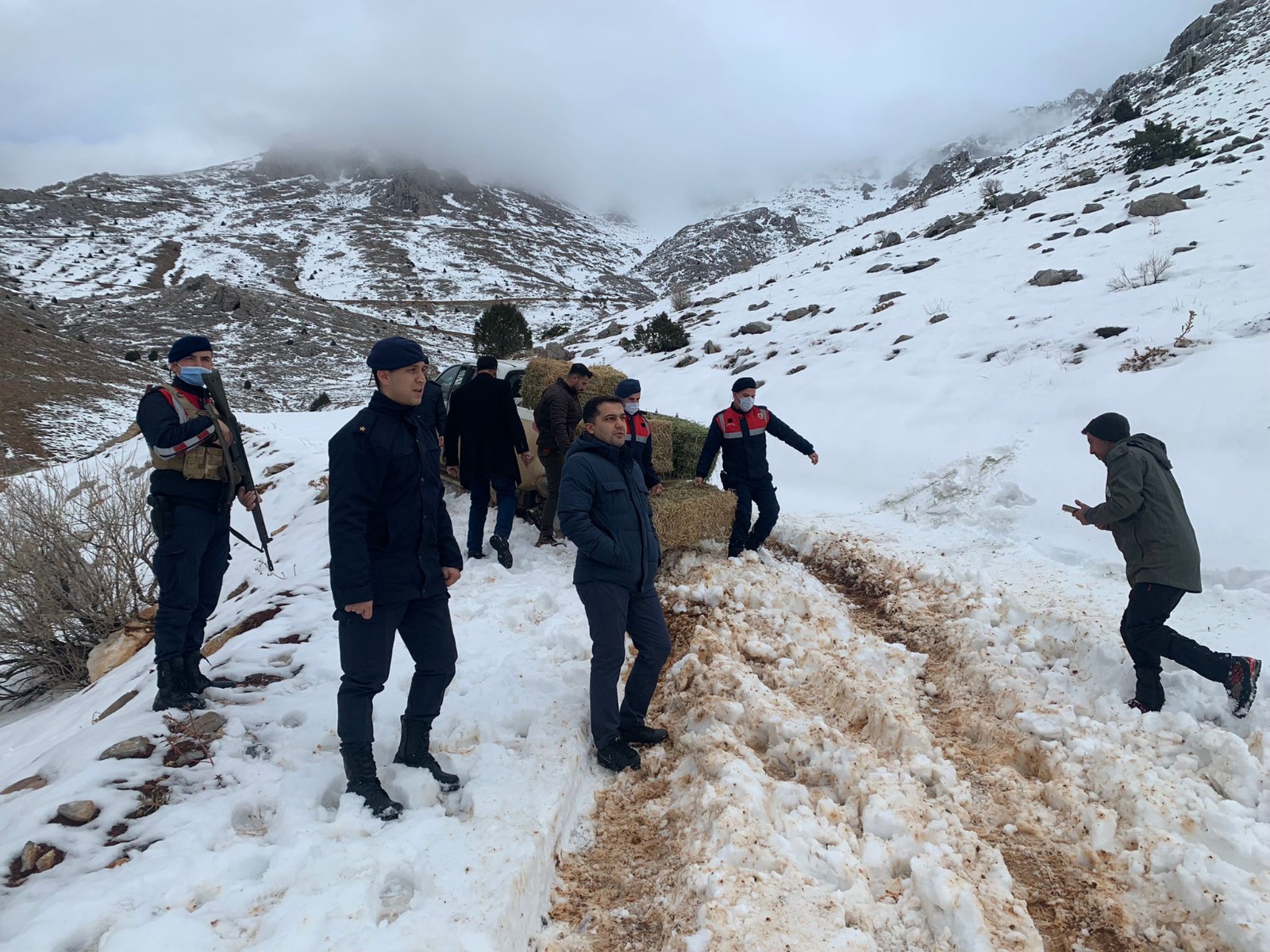 Kahramanmaraş’ta jandarma ekipleri, kar yağışı ile birlikte yem bulmakta güçlük çeken hayvanlar için doğaya yem bıraktı.