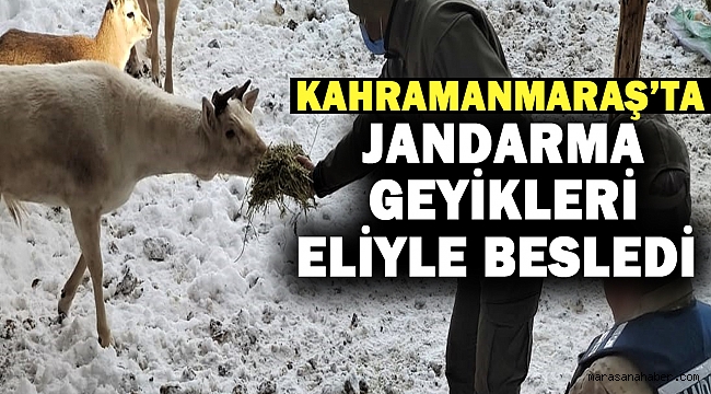 Saman balyalarını fark etmeleriyle görevlilerin yanlarına kalan geyikleri jandarma ekipleri, zaman zaman eliyle besledi.
