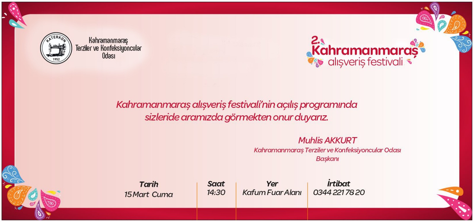 # kahramanmaraş 2. alışveriş festivali 15-24 mart’ta kafum’da# #kahramanmaraş# kahramanmaraş alışveriş festivali# #alışveriş# yusuf güney# bilocan# kahramanmaraş terziler ve konfeksiyoncular odası# #maraş# #haber# #haberler# maraş haber# maraş haberler# kahraman
