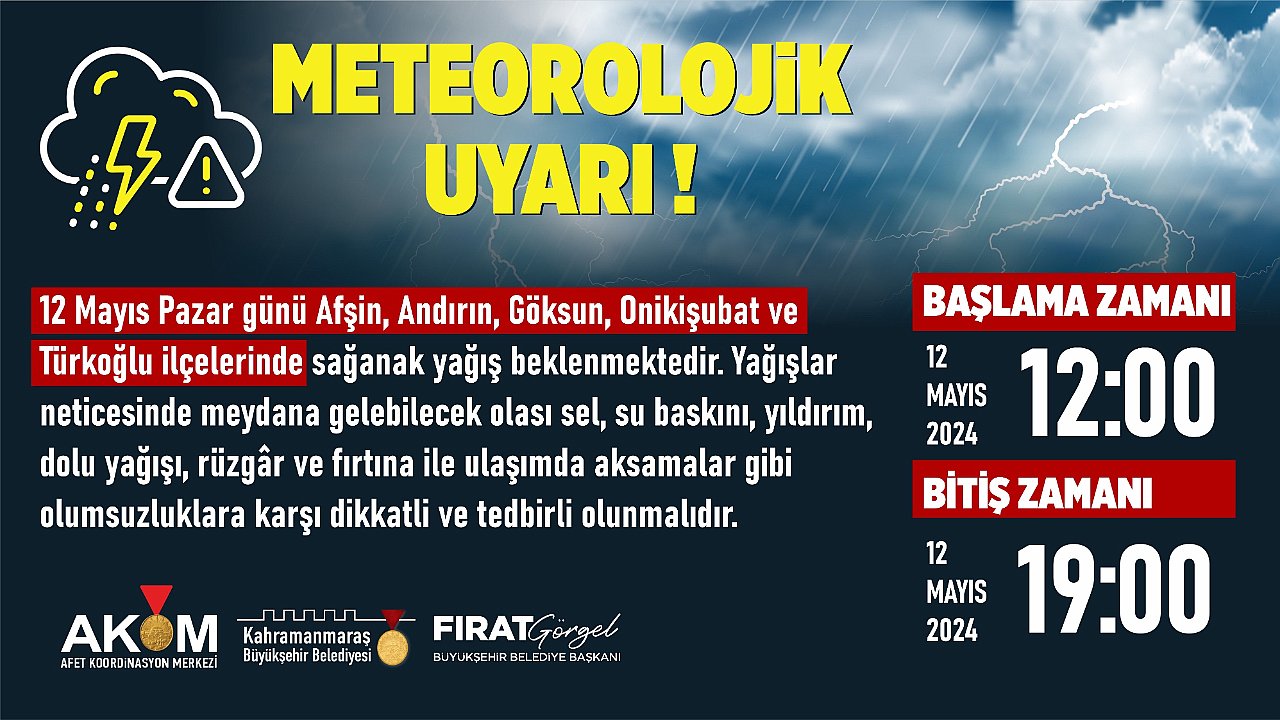 Kahramanmaraş Büyükşehir Belediyesi Afet Koordinasyon Merkezi (AKOM), 12 Mayıs Pazar günü Afşin, Andırın, Göksun, Onikişubat ve Türkoğlu’nda sağanak yağışların etkili olacağını duyurdu. Pazar günü öğle saatlerinde başlaması beklenen yağışların akşam saatlerine kadar devam edeceği öngörülüyor.