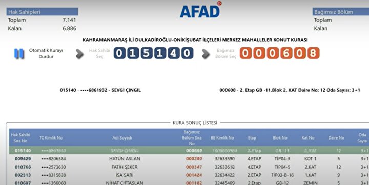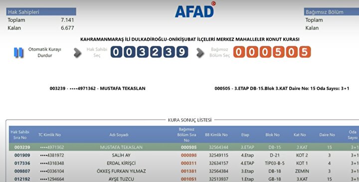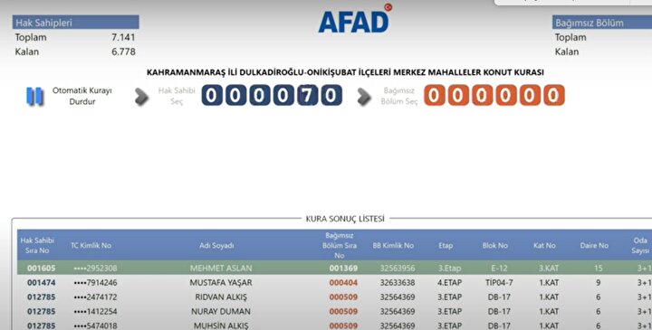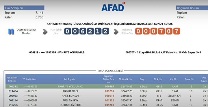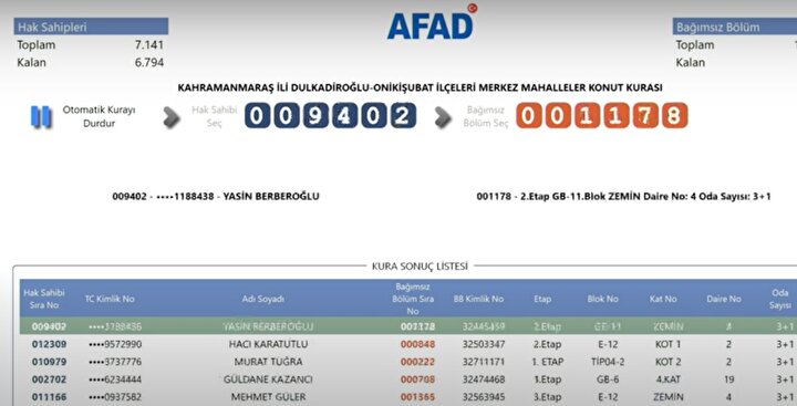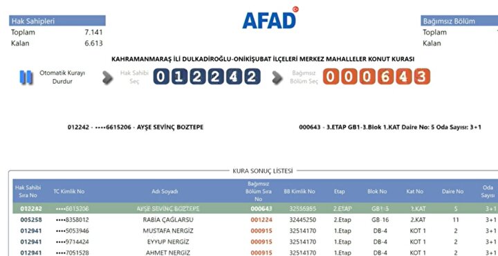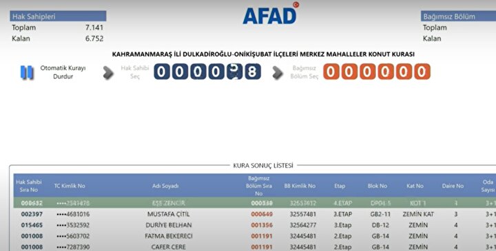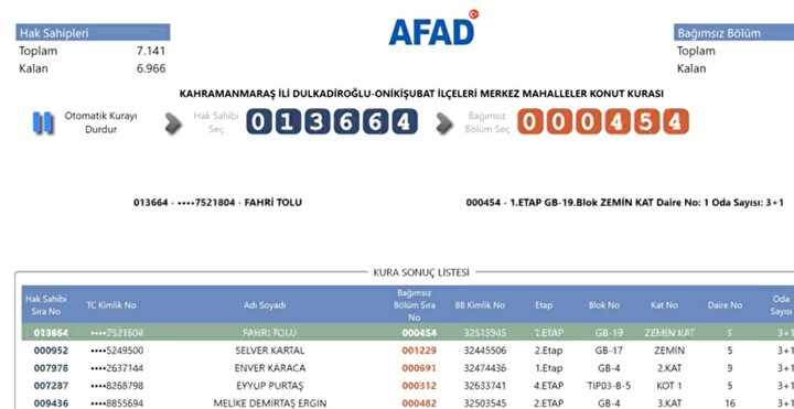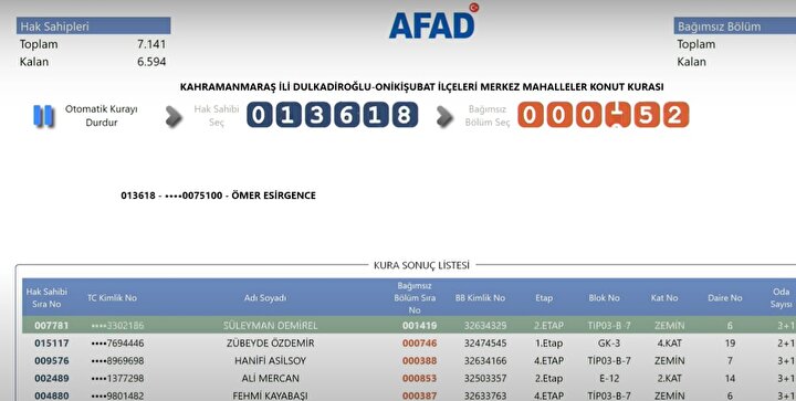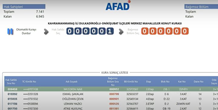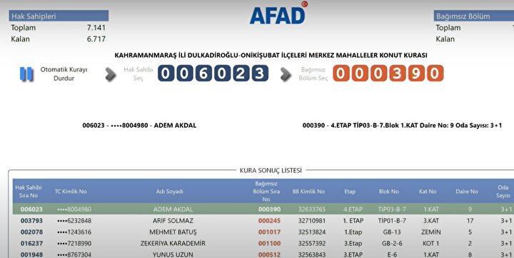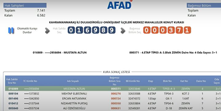 AFAD tarafından yayımlanan kura sonuçlarına göre, Kahramanmaraş'ta deprem konutlarına hak kazanan isimlerin listesi resmi internet sitesi üzerinden erişime açıldı. Depremzedeler, AFAD'ın resmi web adresi üzerinden kura sonuçlarını sorgulayarak hak sahipliği durumlarını öğrenebiliyor.