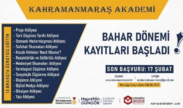 Kahramanmaraş Büyükşehir Belediyesi tarafından düzenlenen Kahramanmaraş Akademi de 2022 Bahar Dönemi başvuruları başladı. Alanında uzman eğitmenler tarafından kursiyerlere verilecek eğitimler arasında Proje Atölyesi, Türk Düşünce Tarihi Atölyesi, Osmanlı Modernleşmesi Atölyesi, Safahat Okumaları Atölyesi, Klasik Metinler Nasıl Okunur?Editörlük ve Redaktörlük Atölyesi, Medeniyet Okumaları Atölyesi, Varoluşsal Düşünce Atölyesi, Sosyolojik Düşünme Atölyesi, Düşünce Atölyesi, Dijital Medya Atölyesi, Diksiyon Atölyesi ve Yazı Atölyesi yer alıyor. Başvurular 12 – 17 Şubat tarihleri Büyükşehir Belediyesi’nin internet sitesi üzerinden (https://kahramanmaras.bel.tr) yapılabilecek. Yedi Güzel Adam Edebiyat Müzesi’nde verilecek olan eğitimler 19 Şubat - 23 Nisan tarihlerinde gerçekleştirilecek. Yapılan açıklamada eğitimler ve başvurular için bilgi almak isteyen kursiyerlerin 0505 185 20 79 whatsapp Danışma Hattı üzerinden ilgili birimlere ulaşılabileceği belirtildi.