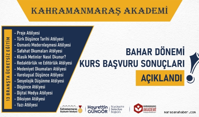 Kahramanmaraş Büyükşehir Belediyesi tarafından düzenlenen Kahramanmaraş Akademi’de Bahar Dönemi başvuru sonuçları açıklandı. Çevrimiçi olarak yapılan başvurulara vatandaşlar yoğun ilgi gösterdi. Yedi Güzel Adam Edebiyat Müzesi, Necip Fazıl Kısakürek Kültür Merkezi ve Büyükşehir Belediyesi Kıraathanesi’nde düzenlenecek olan eğitimlere bin 115 kişi başvuru yaptı. Alanında uzman eğitmenler tarafından kursiyerlere verilecek olan eğitimler arasında Proje Atölyesi, Türk Düşünce Tarihi Atölyesi, Osmanlı Modernleşmesi Atölyesi, Safahat Okumaları Atölyesi, Klasik Metinler Nasıl Okunur? Editörlük ve Redaktörlük Atölyesi, Medeniyet Okumaları Atölyesi, Varoluşsal Düşünce Atölyesi, Sosyolojik Düşünme Atölyesi, Düşünce Atölyesi, Dijital Medya Atölyesi, Diksiyon Atölyesi ve Yazı Atölyesi yer alıyor.
