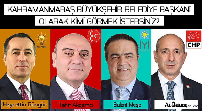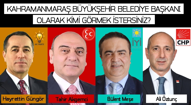 ANKETE KATILMAK İÇİN TIKLAYIN!AK Parti’nin Kahramanmaraş Büyükşehir Belediye Başkan adayını hayrettin güngör olarak açıklaması partililere büyük bir sürpriz oldu. Muhalefet partilerinin ise henüz büyükşehir adayları netleşmedi. Biz de Maraş Ana Haber olarak Kahramanmaraşlı seçmenin nabzını tutmak için Büyükşehir için kamuoyunda konuşulan adaylarla ilgili bir anket yaptık.Ankette Kahramanmaraşlılara; “31 Mart 2019 seçimlerde siyasi partilerin adayları aşağıdaki gibi olsa hangisine oy verirsiniz?” diye sorduk. Kamuoyunda geçen isimler üzerinden gerçekleştirdiğimiz anketimizde Cumhuriyet Halk Partisi’nin Adayı olarak Ali Öztunç, Milliyetçi Hareket Partisi’nin adayı olarak Tahir Akgemci, İYİ Parti’nin adayı olarak Bülent Meşe’yi ve AK Parti’nin adayı Hayrettin Güngör’e yer verdik.ANKETE KATILMAK İÇİN TIKLAYIN!