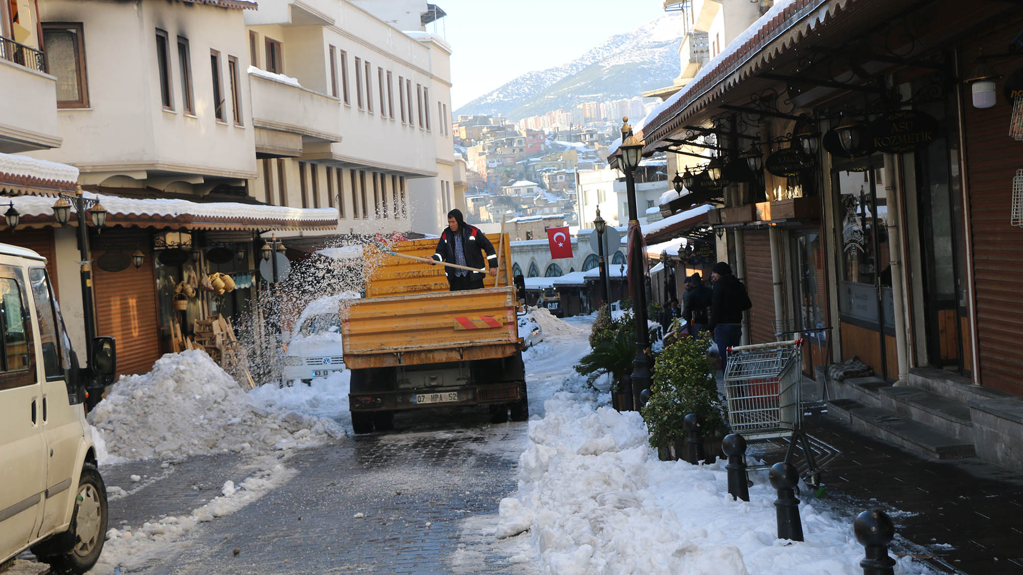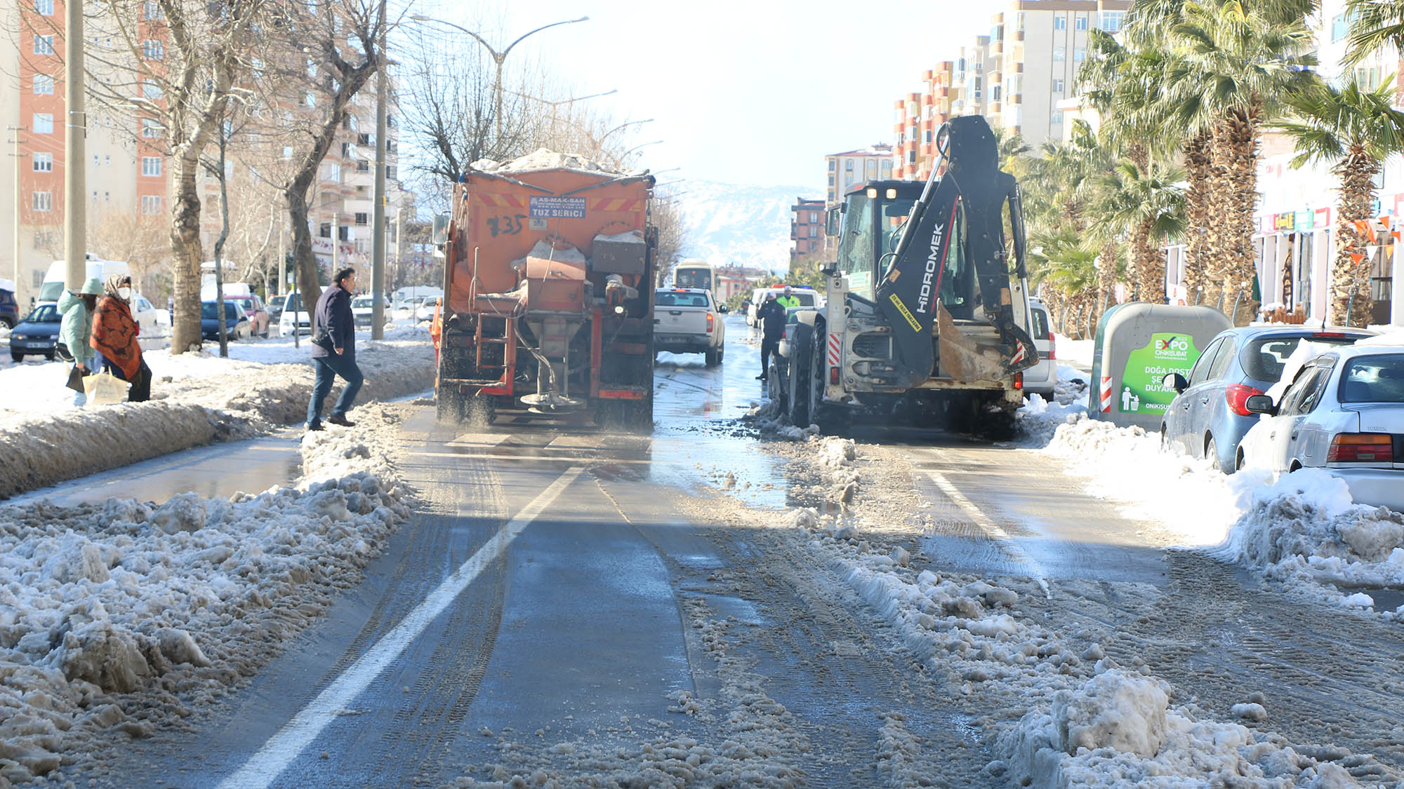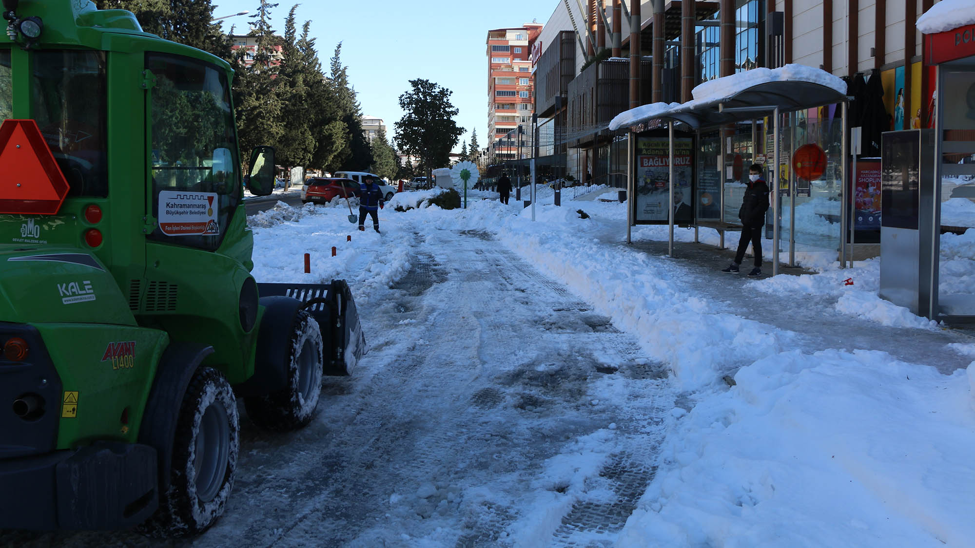Kahramanmaraş Büyükşehir Belediyesi tarafından 3 gündür aralıksız sürdürülen kış şartlarıyla mücadele çalışmaları devam ediyor. Kentin 11 ilçesinde eşzamanlı olarak gerçekleştirilen uygulamalarda 210 iş makinesi ve 400’ün üzerinde personel aktif görev yapıyor. 20 yılın en yoğun kar yağışını alan Kahramanmaraş’ta ana cadde, bulvar ve kavşaklar tamamıyla ulaşıma açılırken; ara yollar, yaya geçitleri, otobüs durakları, hastane ve yürüyüş yollarında da hummalı çalışmalar gerçekleştiriliyor. Bir yandan buzlanma gerçekleşen yürüyüş yollarını tuz ve solüsyon uygulamalarıyla açan ekipler, diğer yandan kar kütlelerini ve yola savrulan muhtelif nesneleri temizliyor.